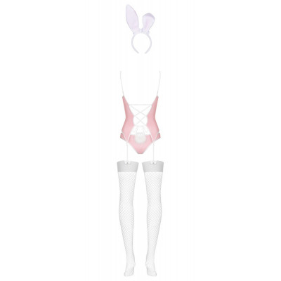 Basco rosa chiaro con bordo bianco. La parte anteriore aperta è chiusa da graziosi fiocchi bianchi. La parte posteriore del basco affascina con l'allacciatura fantasia. Include slip abbinati con una soffice coda bianca e un cerchietto con orecchie da coniglio. Senza calze.